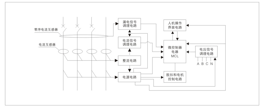 采用零序电流互感器、电流互感器和电压互感器分别检测漏电电路、负载电流和电源电压的实时变化情况。