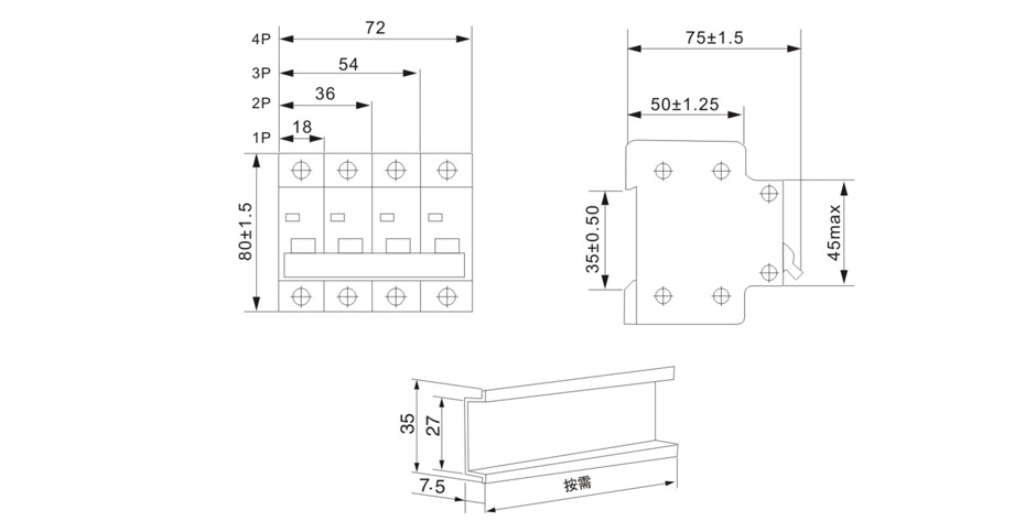 注:安装导轨采用JB6525-92《电器安装轨》TH35型钢安装轨。