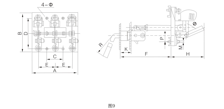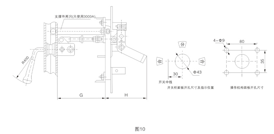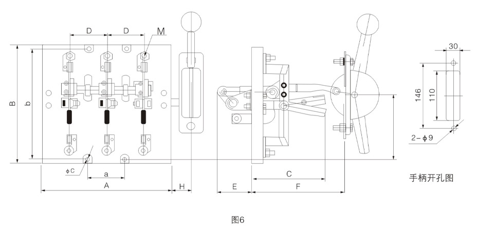 HD13BX系列旋转式刀开关外形与安装尺寸见图9及表10。