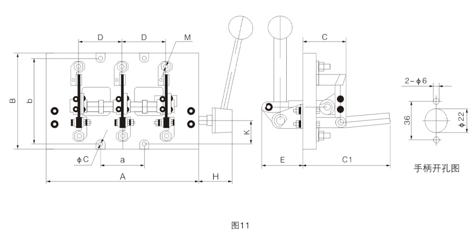 HS13BX系列旋转式刀开关外形与安装尺寸见图10及表11。