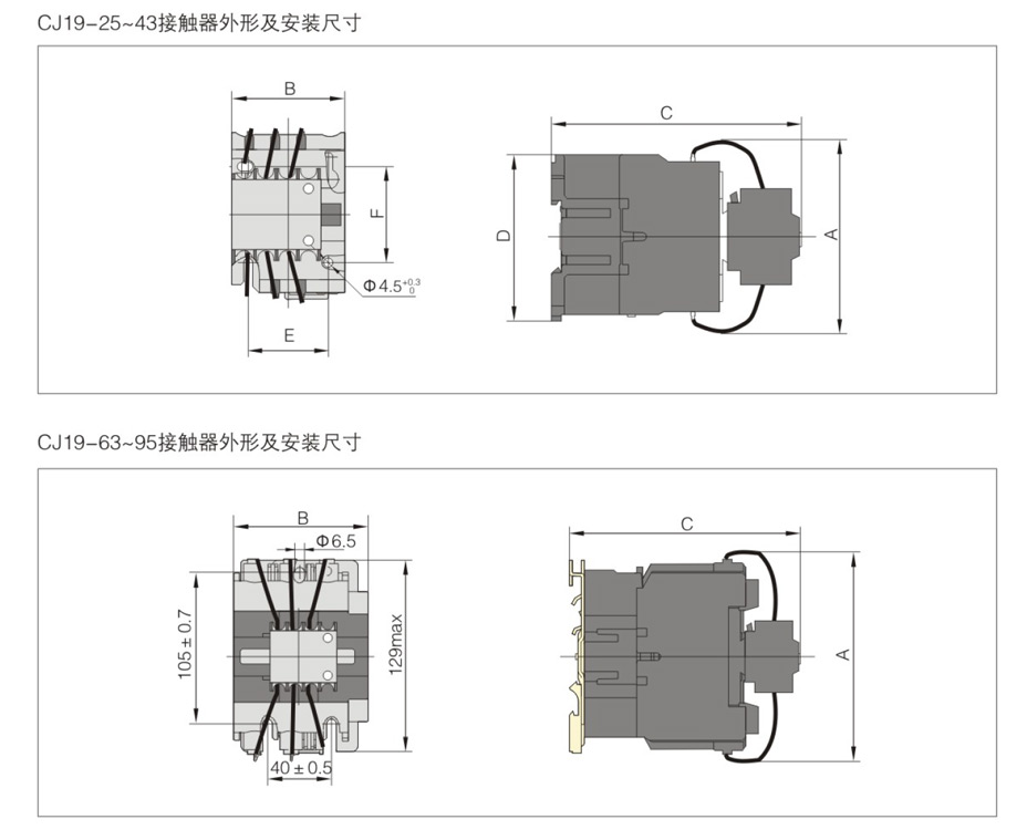 接触器接线端有绝缘罩覆盖,安全可靠。线圈接线端带有标出电压数据,可防止接错。CJ19-25~43接触器可用螺钉安装,也可借底部的滑块扣装在35mm标准卡轨上。面罩上有一个可拆卸的长方形白色小牌,用户可用它打印项目代号等。CJ19-63~95可用35mm或75mm标准卡轨安装。